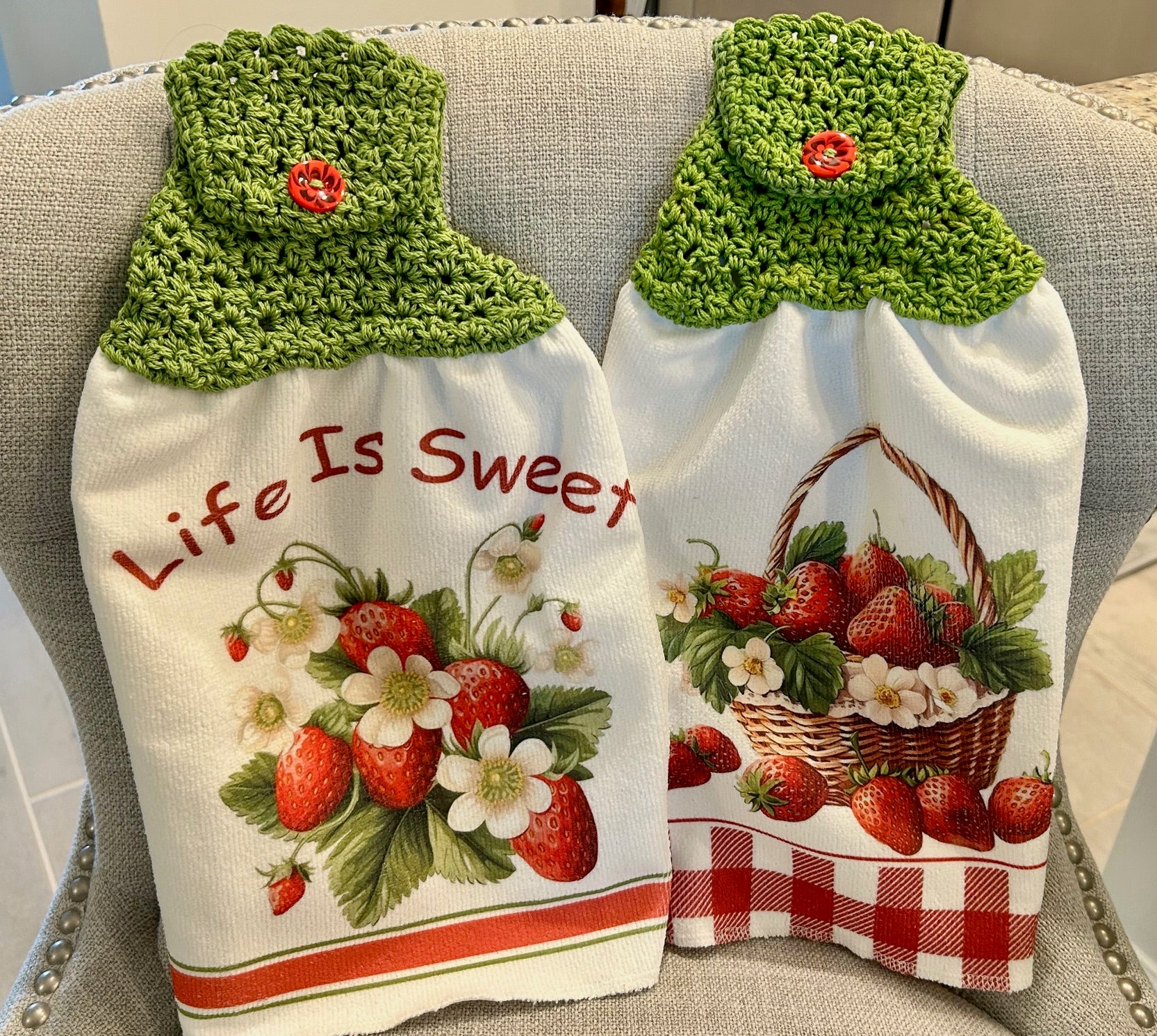 Bright and adorable kitchen towels with a handcrafted crochet top. This also makes a wonderful gift!